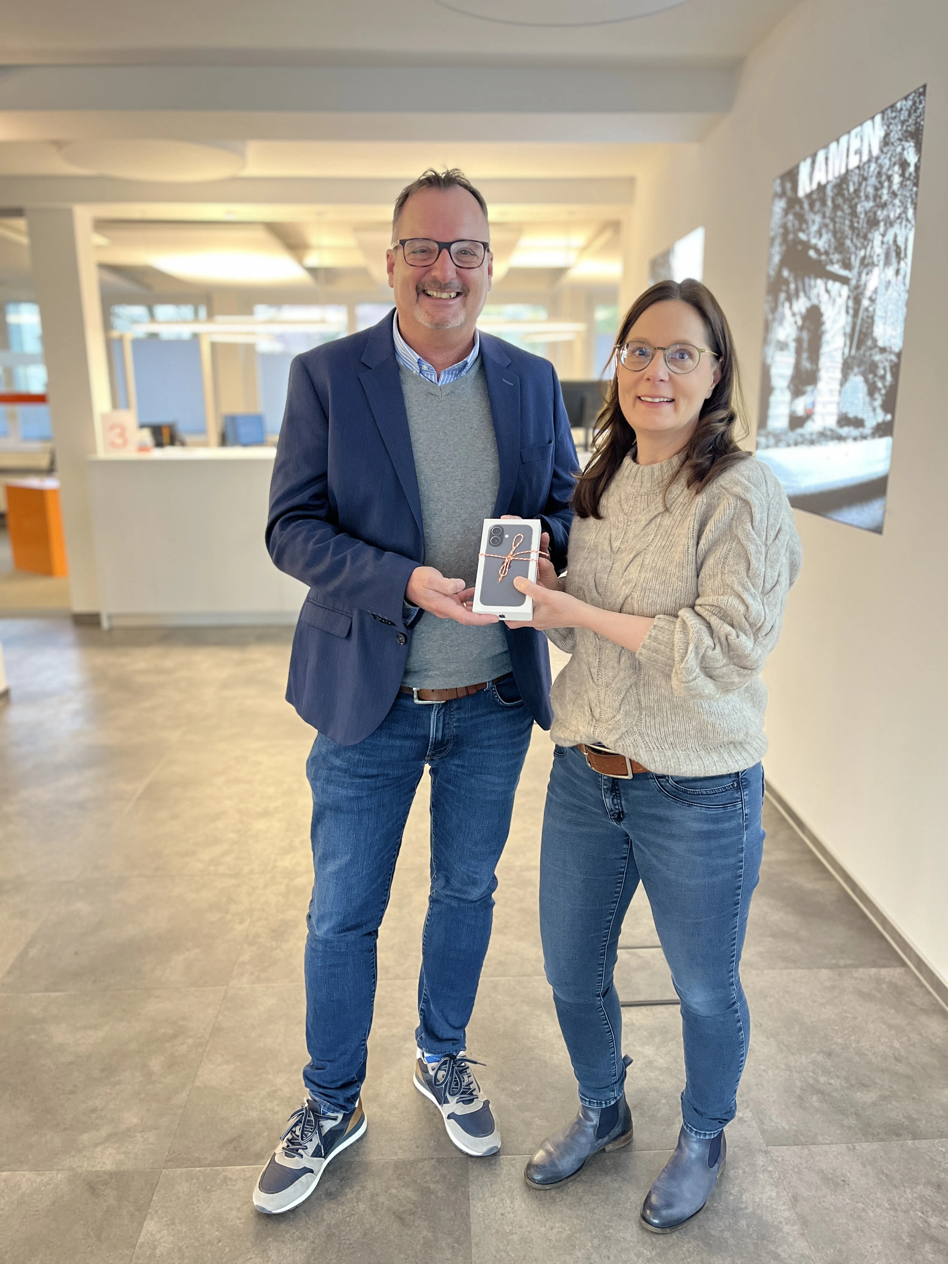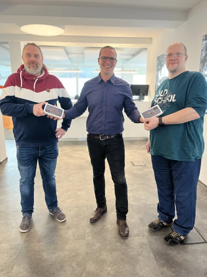 Daniel Dierks nahm stellvertretend für die Firma Salaw Tiefbau den Gewinn entgegen. „Wer das neue iPhone in der Firma erhält, müssen wir mal schauen. Vielleicht machen wir auch ein kleines internes Gewinnspiel daraus“, so der Selmer. Der dritte Gewinner Holger Etzold wird das Smartphone selbst nutzen. „Die Online-Eingabe nutze ich schon länger. Ich hätte nicht damit gerechnet, dass ich dadurch mal etwas gewinnen würde“, sagte der Bergkamener.