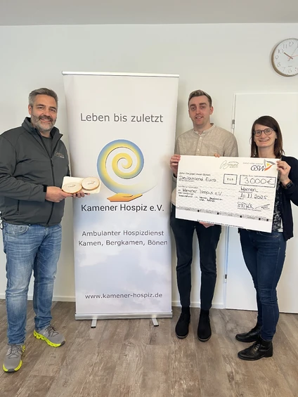 Über eine Spendensumme von 3000 Euro durfte sich der Kamener Hospizverein freuen. Den symbolischen Scheck überreichten Andrea Hihat (GSW) und Stefan Braune (Landbäckerei Braune) nun an Marius Baumann (M.) vom Kamener Hospiz.